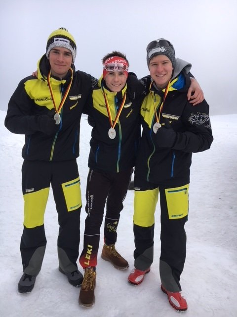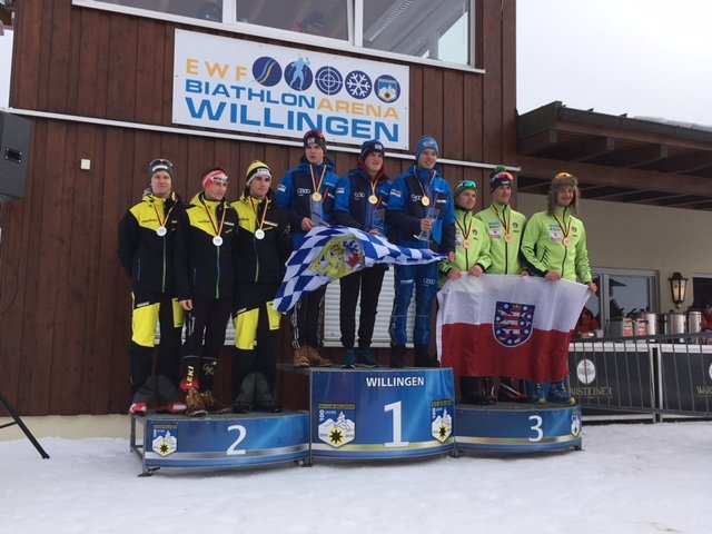 Zum Abschluss standen am Sonntag die Staffel-Wettbewerbe an. 44 Teams kämpften bei ähnlichen Bedingungen wie am Vortag um die Meistertitel. Florian ging als Startläufer für das Team Baden-Württemberg I ins Rennen. Nach den anstrengenden Rennen der Vortage waren die Beine des 16jährigen nicht mehr so frisch und der Balzholzer musste auf der 7,5 km langen Strecke mächtig kämpfen. Am Schießstand stand erfreulicherweise zweimal die Null und so übergab Flo aussichtsreich an Position vier liegend auf seinen Teamkollegen Christian Krasmann vom SC Schönwald. Christian konnte den Rückstand auf die erste Staffel aus Thüringen verkürzen, die beim Wechsel an zweiter Stelle lag. Schlussläufer Elias Asal vom SC Wieden konnte bereits auf der ersten Runde auf den 2. Platz nach vorne laufen. Im Stehendanschlag machte er es aber nochmal äußerst spannend. Aus fast einer Minute Vorsprung entstanden nach einer Strafrunde und einem überragenden Stehendschießen des Thüringer Schlussläufers 10 Sek. Rückstand. Nervenzehrender konnte eine letzte Runde kaum sein. Die vielen Betreuer, Eltern und Athleten feuerten Asal und Barchewitz lautstark an. Es kam zu einem weltcupreifen Zielsprint, der per Fotofinish entschieden werden musste. Die Staffel Baden-Württemberg holte nach 1 Std. 12:15.0 Min. Silber hinter der souveränen Staffel aus Bayern und einen Wimpernschlag vor Thüringen, die sich dann aber trotzdem über die gewonnene Bronzemedaille freuen konnten.