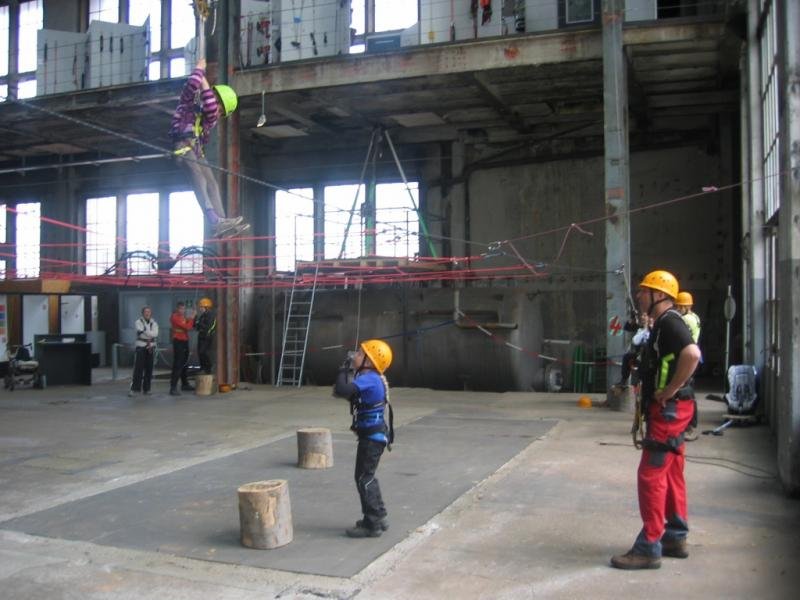 Für Sonntag, den 22.04.2012 organisierte Michael Stritzel für unsere Biathleten mit ihren Eltern einen Besuch im Hochwerk in Marbach. Michael ist einer der Ausbilder im Hochwerk. Das Hochwerk ist ein altes Kraftwerk der ENBW . Heute ist es ein international anerkanntes Ausbildungszentrum für die Feuerwehr, Telekom, Helikopterrettung und vieles mehr. Es dient auch der Teamfindung für Firmen. Träger des Ganzen ist die Fa. Bornack, die auch die Abnahmen in punkto Sicherheit vornimmt. Zuerst hangelten wir uns an zwei Drahtseilen in 10m Höhe durch die Halle, danach versuchten wir mit 15 Personen eine große Holzwippe in das Gleichgewicht zu bringen. Bei der nächsten Übung versuchten wir alle 17 Personen eine 4,20m hohe Wand hochzubringen, dabei verließen uns leider beim Letzten die Kräfte. Bei der Spinnenübung mussten wir eine Person, die an 4 Seilen hing, durch ein Spinnennetz hochziehen und an einer anderen Stelle wieder ablassen. Einer gab das Kommando und die Anderen mussten gefühlvoll versuchen, die angeseilte Person zu steuern. Wurde das Spinnennetz berührt, klingelten schrill die Glöckchen. Nach einer kurzen Pause ging es weiter zum Pendel. 15Personen zogen eine angeseilte Person so schnell wie möglich auf 10-12m Höhe, dort durfte dann genussvoll hin- und hergependelt werden. Die Übung, die am meisten Mut erforderte, war ein Sprung in den freien Fall von einem Brett in 12m Höhe. Gut gesichert durch das Bodenpersonal, war auch dies kein Problem. Zum Abschluss ging es noch an einer Leiter ca. 10m hoch um dann an einer glatten Holzwand abgeseilt zu werden.
