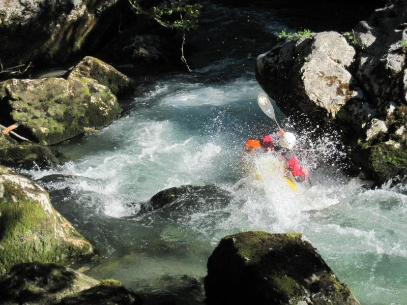 Vor dem gemeinsamen Abendessen, stand noch die Griesenschlucht auf dem Plan. Die vier Kilometer lange Wildwasserstrecke bietet einen herrlichen Naturslalom mit engen Durchfahrten, unübersichtlichen Verblockungen und erheblichem Gefälle. Namen wie "Schlüsselloch, Dom und Treppenhaus" stammen aus der "Faltbootärea", als diese Passagen noch echte Kriterien waren. Aber auch Baumhindernisse können eine erhebliche Gefahr darstellen, besonders bei höheren Wasserständen. Die technisch anspruchsvollen Passagen verlangen dem fortgeschrittenen Wildwasserpaddler das ganze Können an Paddelschlagtechniken und auch das Kehrwasserfahren muss sitzen.