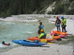 Für Landschaftsgenießer ist die obere Isar einer der beliebtesten Wildflüsse der Alpen. Sie verläuft als schmaler, kristallklarer Gebirgsbach inmitten einer einsamen, wildromantischen Gebirgslandschaft. Da das Taxi noch nicht fährt, müssen wir mit dem Bootswagen die Kajaks die acht Kilometer lange Strecke bis zum Einstieg hochziehen. Zunächst fließt die Isar mit schneller Strömung ohne nennenswerte Schwierigkeiten durch ein offenes Kiesbett.