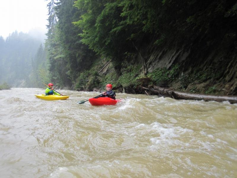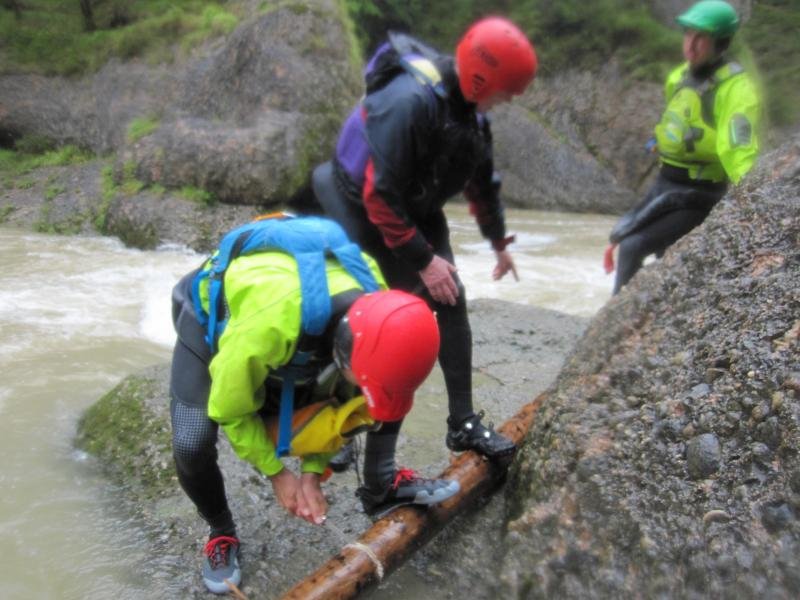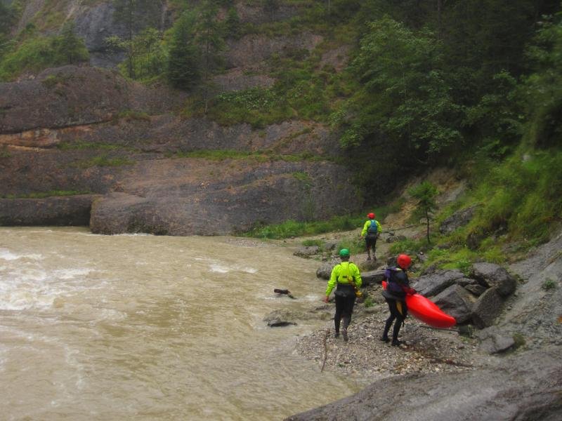 Die geplante Canyoningtour durch die Starzlachklamm bei Sonthofen war leider wegen Hochwasser nicht durchführbar. Die Ammer hatte gut Wasser, 1,60m. Walter Remmel beschrieb die Erstbefahrung der Ammerschlucht 1931: "Ein Stündchen etwa liegt der Katarakt hinter uns. Scharf nach rechts biegt die Ammer, Felswände steigen vor uns auf, das Wasser beginnt zu ziehen, wir fahren in die "Scheibum" ein..... wer nicht firn auf Wildwasser ist, der wird gut tun, sich diese Stelle gründlich vorher anzusehen!"