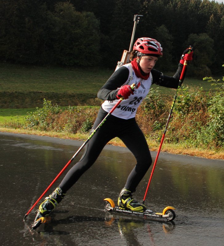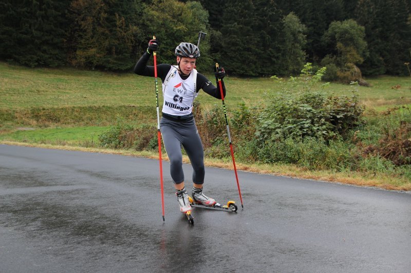 Die nicht von allen Biathleten geliebte Disziplin startete mit dem Rennen der männlichen Jugend. Gestartet wurde in 5-er Gruppen mit jeweils 10 Sekunden Zeitabstand auf Grund der Schießergebnisse des Vortages – jedoch in umgekehrter Reihenfolge. Die besten Schützen starteten als Letzte. Timo konnte sein gesamtes Rennen ohne Wasser von „Oben“ absolvieren und beendete das Rennen als 22. . Im Anschluss an sein Rennen begann es kräftig zu regnen, dass Wasser floss in Strömen über die Strecke, welche im Vorfeld für das Rennen präpariert wurde, um einen guten Gripp der Rollen der Skiroller zu gewährleisten. Im Gegensatz zu Timo mussten Nicola und Ann-Tina komplett bei Dauerregen und ca. 5°C die 7,5 km Strecke absolvieren. Wiedererwarten konnte sich Nicola gegen eine starke Laufkonkurrenz auf dem 4.Platz behaupten. Nicht weniger stark war die Konkurrenz bei Ann-Tina, Sie beendete das Rennen auf Platz 15.