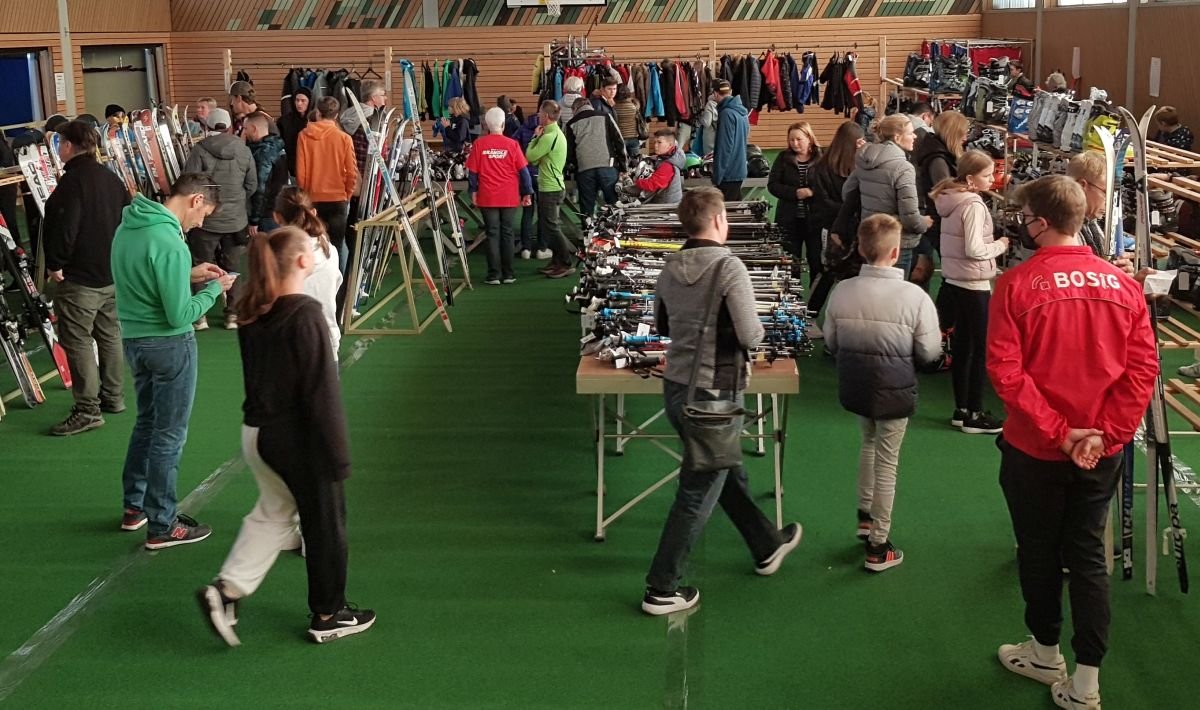 Ein großes Angebot an neuwertigen und gebrauchten Wintersportartikeln von Skiern, Skistiefeln, Wintersportbekleidung, Helmen, Schlittschuhen, Snowboards und Skistöcken wurde angeboten und verkauft.