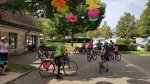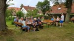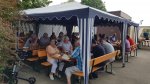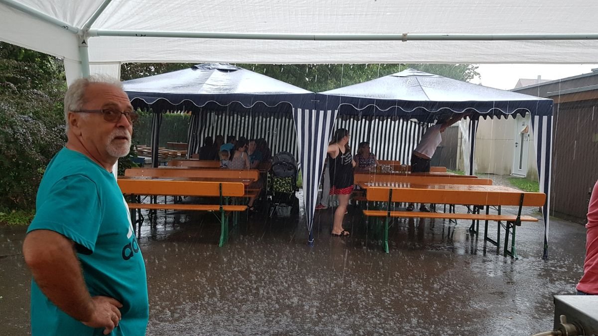 Wir absolvierten den Rest der Tour bis zum Vereinsheim wo uns auch kurz nach 12 Uhr die schon vorab reservierten Weißwürste und das zugehörige Kaltgetränk noch gut schmeckten. Die Tische waren gut besetzt. Gegen 15 Uhr zogen dunkle Wolken von Südwesten Richtung unseres Festplatzes. Die ersten Regentropfen ließen nicht lange auf sich warten, die meisten Gäste ergriffen die Flucht vor den immer bedrohlicheren Wolken. Ein sehr heftiger Regenschauer, begleitet von einer starken Windböe, überschwemmte kurzfristig die Festwiese. Die wenigen verbliebenen Gäste halfen dankenswerter Weise mit unsere Zelte zu sichern. Das Sommerfest fand so ein abruptes Ende. Die wenigen verbliebenen Gäste durften sich über ein Freibier freuen.