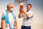 Als weiterer Programmpunkt wurde Simon ein mit Bier gefülltes 3-Literglas überreicht aus dem er einen großen Schluck nahm. Moderator Betz meinte dazu: „Ich dacht ein Leistungssportler zieht das in einem Zug durch,.. )