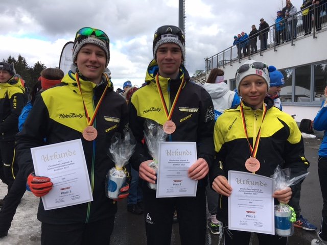 Durch das anhaltende Tauwetter hatten sich die Bedingungen am Sontag nochmals verschlechtert und die Athleten hatten in den Staffelrennen in der Spur eine regelrechte Wasserschlacht zu schlagen. Bei wieder nur noch 3 Grad Lufttemperatur war jeder glücklich, dass es zumindest von oben trocken blieb. Durch die guten Leistungen in Einzel und Sprint schaffte es Florian gemeinsam mit Christian Krasmann (SC Schönwald, Skiinternat Furtwangen) und Florian Lipowitz (DAV Ulm, Schigymnasium Stams/Österreich) in die Staffel Baden-Württemberg I. Christian (liegend fehlerfrei, 2 Strafrunden stehend) übergab an Position zwei auf Florian, der sich mit den Athleten aus Bayern I und III sowie Thüringen I gemeinsam auf die Strecke machte. Liegend stand bei allen vier Führenden die Null (Florian ohne Nachlader), auf der Strecke konnte sich Thüringen leicht absetzen. Nach dem Stehendanschlag musste der Baden-Württemberger leider einmal in die Strafrunde. An Position vier übergab der 15jährige mit knappem Rückstand an seinen Teamkollegen Lipowitz. Der 16jährige, einer der allerschnellsten in der Loipe, kam nach fehlerfreiem Liegendschießen gemeinsam mit der Staffel Bayern I zum letzten Schießen. Leider musste er nach 2 Strafrunden seine Kontrahenten aus Thüringen und Bayern ziehen lassen. Bayern I gewann am Ende knapp vor Thüringen I und Baden-Württemberg I.