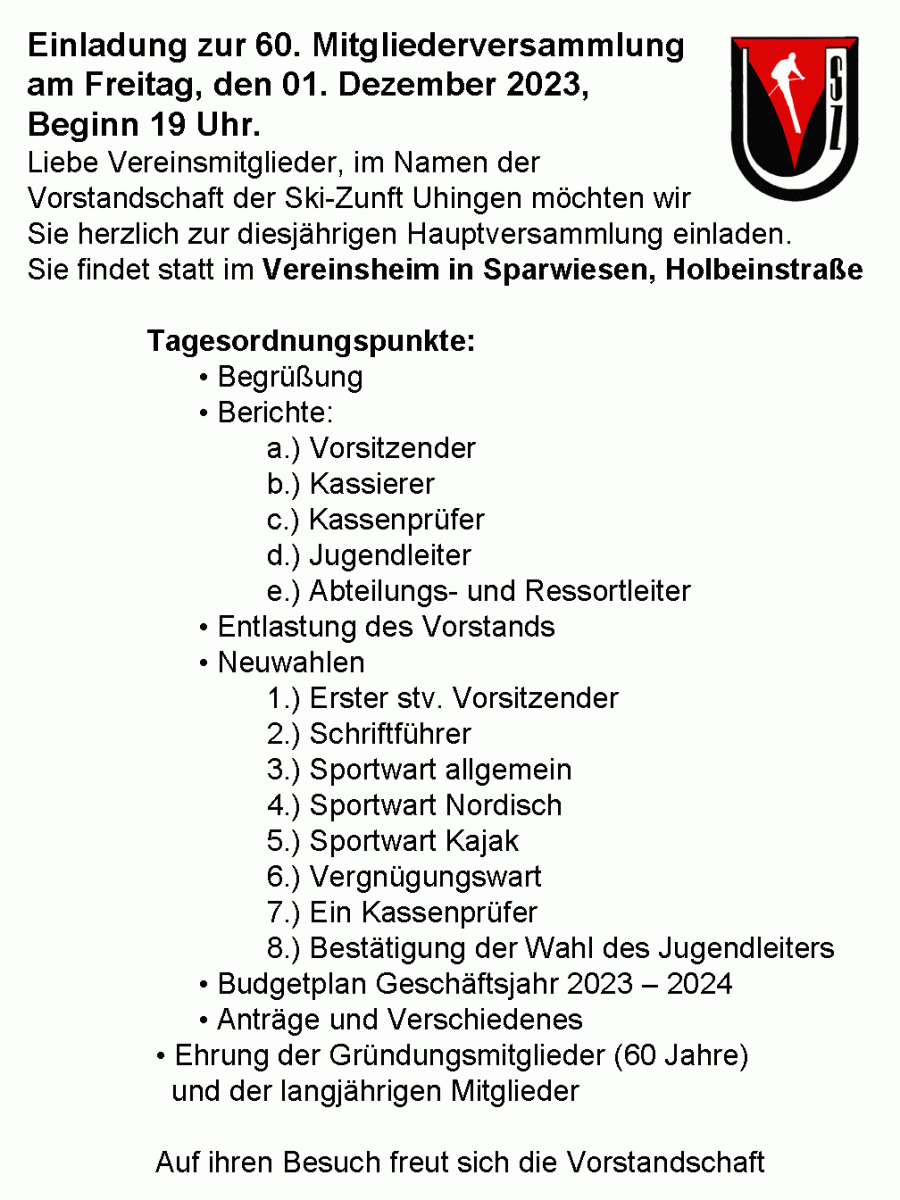 60. Mitgliederversammlung der Ski-Zunft Uhingen. Siehe Anhang!