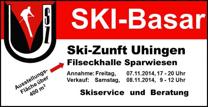 Am Samstag, den 08. November 2014, veranstaltet die Ski-Zunft Uhingen in der Filseckhalle Sparwiesen ihren diesjährigen Skibasar. Die Bevölkerung ist herzlich eingeladen die Einrichtung des Skibasars zu nutzen. Hier besteht die Möglichkeit alle Artikel rund um den Wintersport für Groß und Klein zum Verkauf anzubieten oder einzukaufen. Für die Vermittlung und Bereitstellung der Räumlichkeiten erheben wir eine geringe Gebühr.